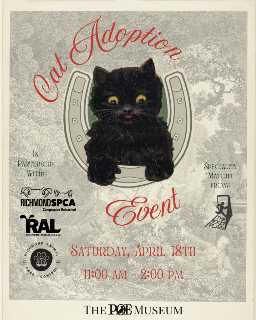 Join us on Friday, June the 13th for the Poe Museum’s second annual Black Cat Adoption Day, in partnership with Richmond Animal League, the Richmond SPCA, Richardsons Rescue and Hanover Community Cats! From 5:30-7:30pm on Friday the 13th, the Enchanted Garden will once again be full of feline friends — and we’re not just talking about Edgar and Tib…