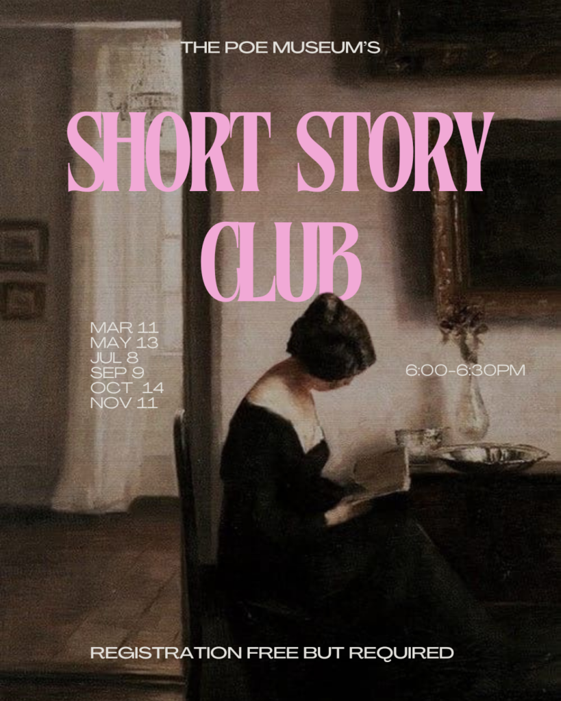 Join the Poe Museum for our virtual Short Story Club, a low-commitment literary gathering designed for busy reader who may not be able to commit to reading a new book every month. Our Short Story Club meets once a month on Tuesdays on Zoom from 6:00pm-6:30pm–a perfect chance to unwind midweek, connect with fellow literature lovers, and enjoy new reads—all without ever leaving your living room. Each meeting we will explore one Poe short story paired with a complementary piece by another author.