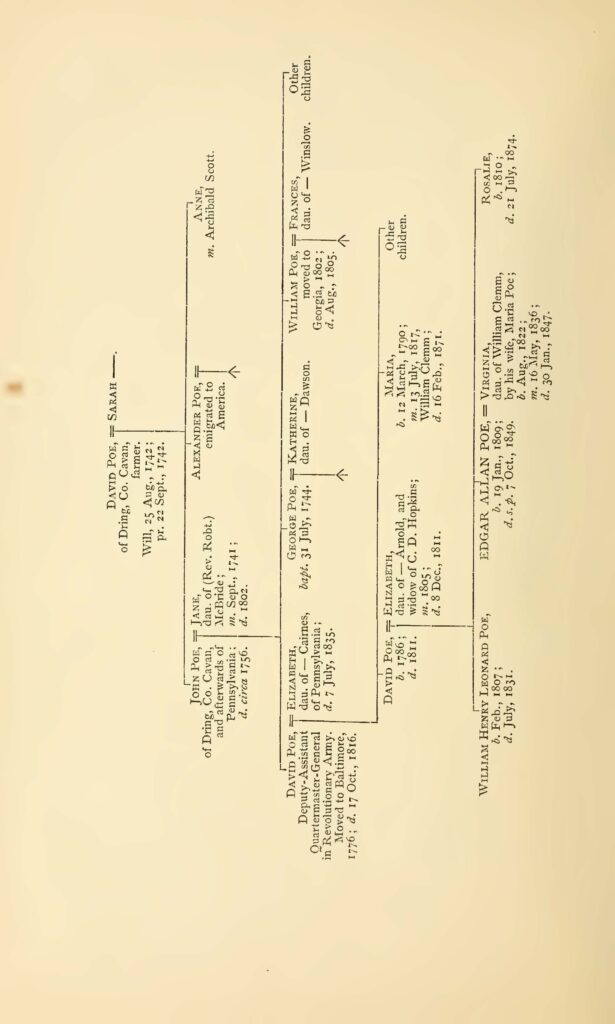 Happy St. Patrick’s Day! Did you know Edgar Allan Poe had Irish ancestry? Edgar’s great-great grandfather, David Poe, is the namesake for Poe’s grandfather and father. David Poe of Dring, in the Parish of Kildallon in County Cavan, lived from around 1645-1742. His will is dated August 25th, 1742 and lists his occupation as a farmer, his wife as Sarah, and his children as John and Alexander. Other documents relating to Poe include the parish’s vestry book where he is referenced as the overseer of the parish roads and includes his signature of ‘David Pooe.’i Poe’s son John and his son David Poe (Edgar’s grandfather) grew up in Ireland until the family immigrated to Pennsylvania and later, Baltimore, Maryland.